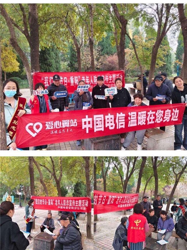 金秋送爽,重阳情暖。在中国传统节日重阳节之际,中国电信安阳分公司走进社区公园,组织开展 “我们的节日·重阳” 老年人防诈宣传主题活动,以贴心服务与反诈知识,为老年群体送上一份特殊的节日关怀。